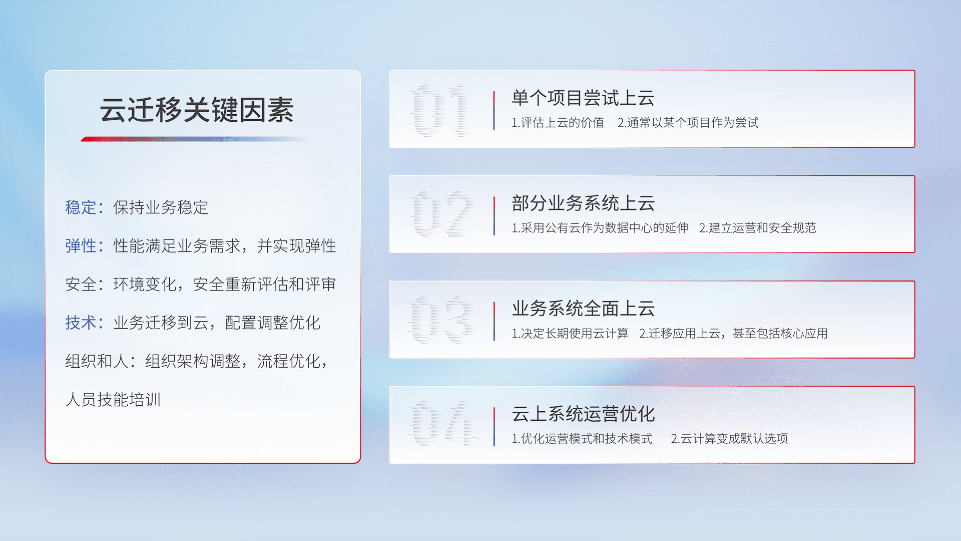 结合实际业务,,从规划设计、、、、云平台选型、、云原生改造、、数据迁移、、集成交付,,迁移全过程为客户识别最佳上云路径,,做好风险识别管理,,设计网络架构、、、身份权限、、、安全审计合规、、操作审计、、、、日志审计、、、监控告警策略、、多站点容灾设计等,,对云上基础设施进行整体规划,,,,提升IT治理水平,,,,以满足弹性、、高可用、、、、高性能的需求。。。。
