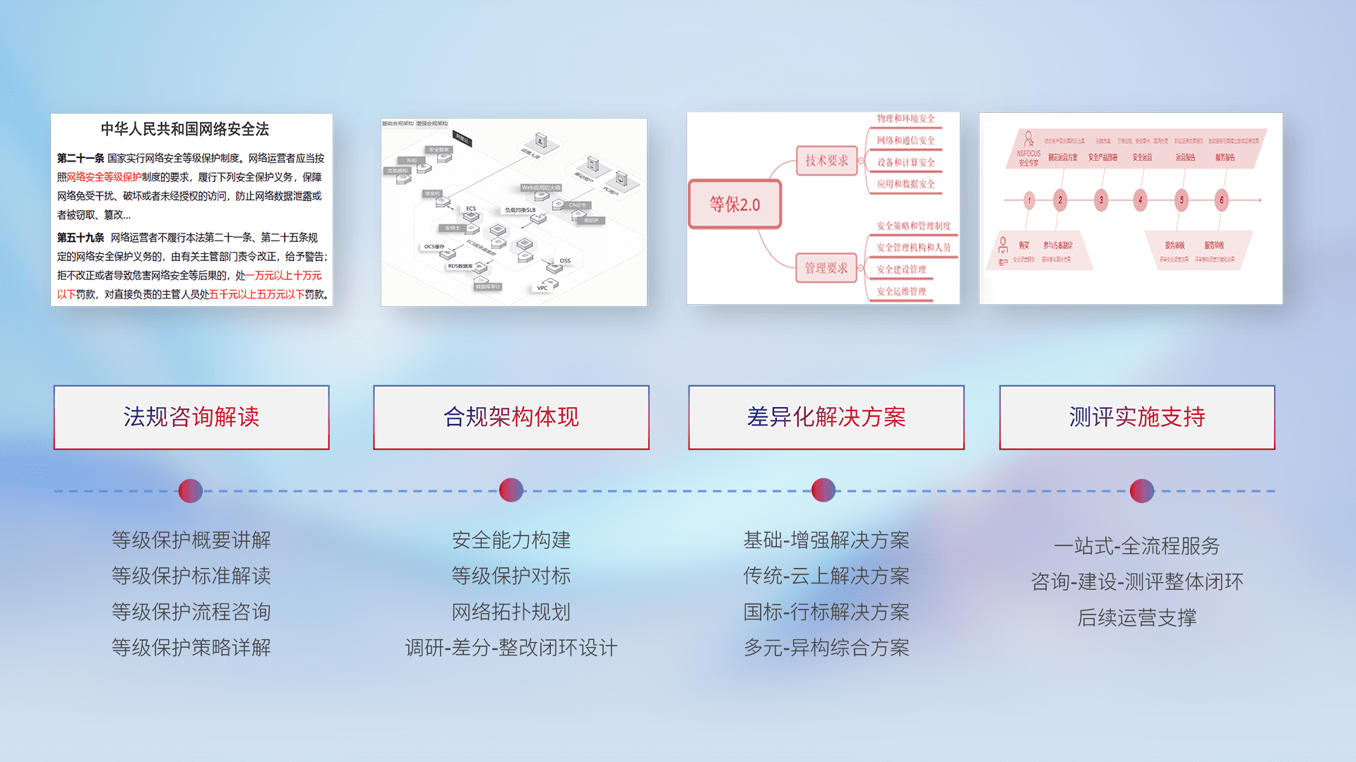 通过专业的法律咨询解读、、、、合规架构体现、、、、差异化解决方案、、、、测试实施支持等服务,,,为客户量身打造等保合规体系。。。